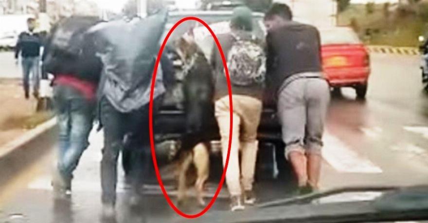 Εν ριπή οφθαλμού, όχι μόνο άγνωστοι περαστικοί και φίλοι του ιδιοκτήτη συμμετείχαν στο σπρώξιμο του αυτοκινήτου, αλλά και το πιστό σκυλάκι του, αντί να μείνει αναπαυτικά μέσα στο αυτοκίνητο, θεώρησε ότι θα ήταν πολύ απερίσκεπτο εκ μέρους του να μην βοηθήσει.