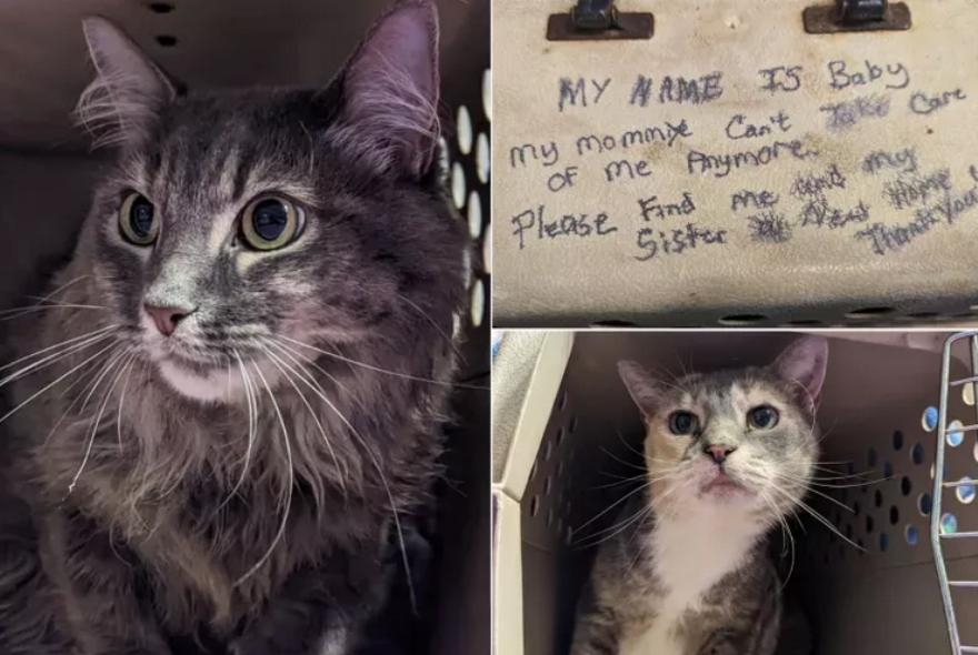 Το σπαρακτικό μήνυμα έγραφε: “Το όνομά μου είναι baby, η μαμά μου δεν μπορεί να με φροντίσει πια. Σας παρακαλώ βρείτε σε μένα και την αδελφή μου το επόμενο σπίτι μας. Σας ευχαριστώ”. Το προσωπικό του Brother Wolf Animal Rescue μετονόμασε τις δύο γάτες σε Junebug και Magpie και υπολόγισε την ηλικία τους σε περίπου 3 και 5 ετών.