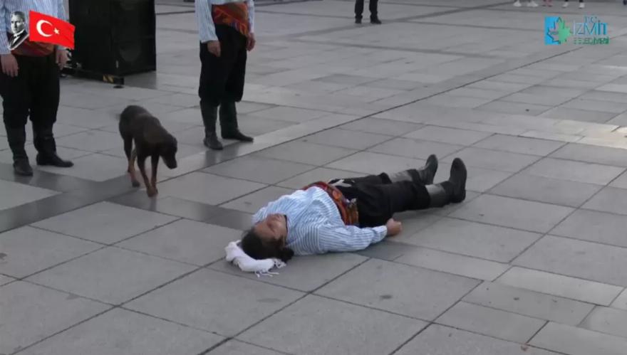Καθώς ο Uzunsoy ήταν ξαπλωμένος στο έδαφος, ο υποτιθέμενος πόνος του δεν πέρασε απαρατήρητος. Από τα παρασκήνια, ένας ανήσυχος αδέσποτος σκύλος έκανε την εμφάνισή του – διακόπτοντας το έργο για να προσφέρει στον “τραυματισμένο” ξένο παρηγοριά.