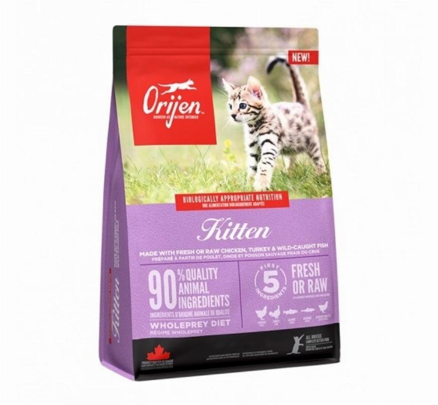 Πλήρης τροφή Orijen χωρίς σιτηρά για ανήλικες γάτες με κοτόπουλο, γαλοπούλα, σολομό, ρέγγα και συκώτι. Συγκεκριμένα, αποτελείται απο 90% ζωϊκά συστατικά εκ των οποίων είναι φρέσκα ή ωμά, τα οποία είναι υψηλά σε πρωτεΐνη και λιπαρά οξέα. Συμβάλλει στην υγιή ανάπτυξη του μυικού συστήματος και των οστών, λόγω της υψηλής περιεκτικότητας ακατέργαστης πρωτεϊνης, ενώ τα λιπαρά οξέα EPA-DHA και η ταυρίνη διατηρούν την καλή υγεία του εγκεφάλου και των ματιών, που είναι το κλειδί για μια μακρά και υγιή ζωή.Η τροφή αυτή είναι ένας ανεκτίμητος σύμμαχος για την καλή υγεία της γάτας σας, καθώς και για ένα υγιές τρίχωμα και δέρμα λόγω των Ω-3 και Ω-6 λιπαρών που περιέχει. Η Orijen Kitten συνιστά επομένως την ολοκληρωμένη λύση για μια ισορροπημένη και υγιή ζωή της γατούλας σας!