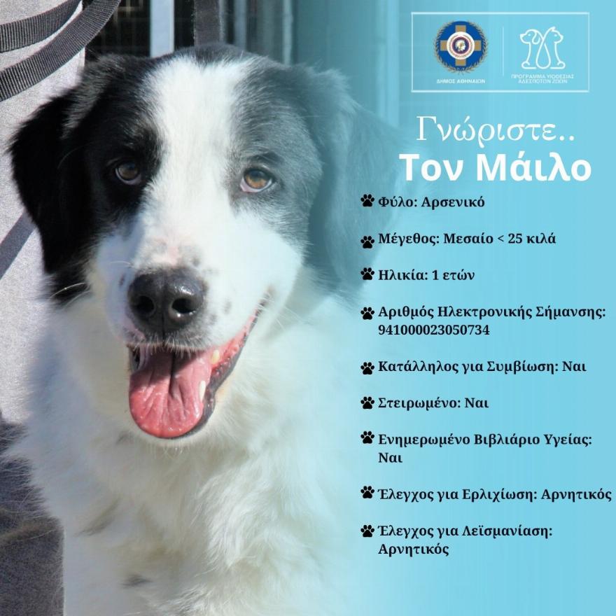 Ο Μάιλο είναι ένα ζωηρό και ενεργητικό σκυλί. Πρόκειται για έναν αρσενικό σκύλο μεσαίου μεγέθους, κάτω των 25 κιλών, και είναι μόλις ενός έτους. Ο αριθμός ηλεκτρονικής σήμανσής του είναι 941000023050734.