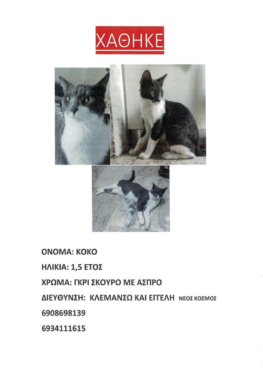 Χάθηκε γάτα στις 3/7 στις 7 π.μ. στον Νέο Κόσμο, στη διασταύρωση των οδών Κλεμανσώ και Εγγελή. Ο γάτος είναι στειρωμένος, ζυγίζει 5-6 κιλά και ακούει στο όνομα Κόκο. Είναι ιδιαίτερα ομιλητικός και φιλικός.
