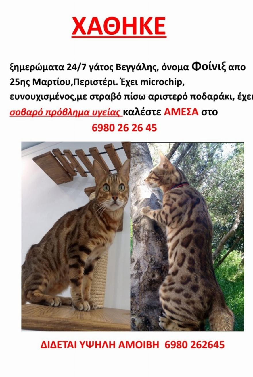 Ο Φοίνιξ, ένας γάτος Βεγγάλης με microchip, ευνουχισμένος και με στραβό πίσω αριστερό ποδαράκι, εξαφανίστηκε ξημερώματα 24/7 από την περιοχή της 25ης Μαρτίου στο Περιστέρι. Ο Φοίνιξ αντιμετωπίζει σοβαρό πρόβλημα υγείας και η κατάσταση του είναι κρίσιμη, κάτι που καθιστά την αναζήτησή του επείγουσα και ζωτικής σημασίας. ΕΓια οποιαδήποτε πληροφορία που θα οδηγήσει στην εύρεση του Φοίνιξ, δίνεται υψηλή αμοιβή. Η άμεση δράση μπορεί να σώσει τη ζωή του, γι’ αυτό σας παρακαλούμε να βοηθήσετε όσο το δυνατόν πιο γρήγορα.
