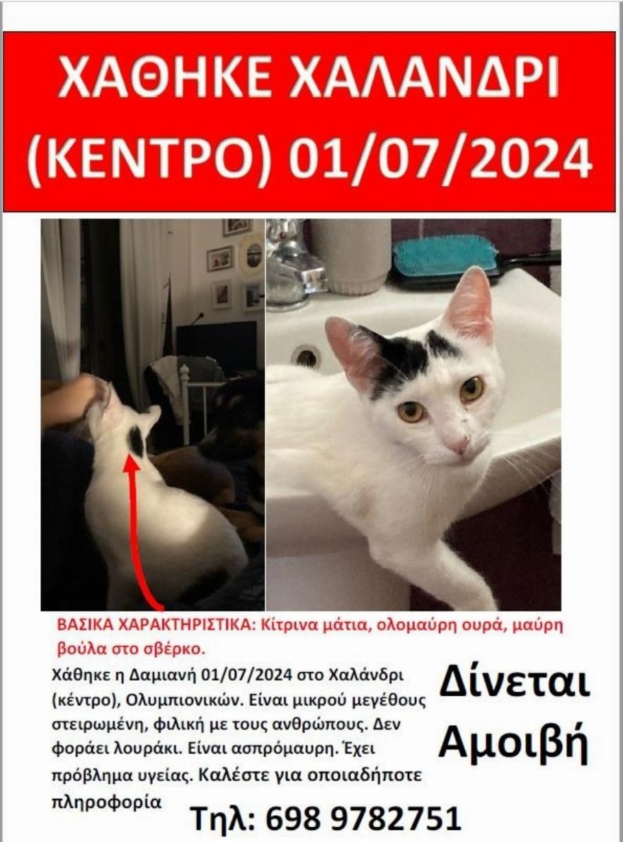 Χάθηκε η γάτα Δαμιανή στις 1 Ιουλίου 2024 στο Χαλάνδρι, στην περιοχή του κέντρου, στη συμβολή των Ολυμπιονικών. Είναι μικρού μεγέθους, με κίτρινα μάτια και ολομαύρη ουρά. Φέρει μαύρη βούλα στο σβέρκο. Είναι στειρωμένη και φιλική προς τους ανθρώπους, αλλά δεν φοράει λουράκι. Είναι ασπρόμαυρη και έχει πρόβλημα υγείας.
