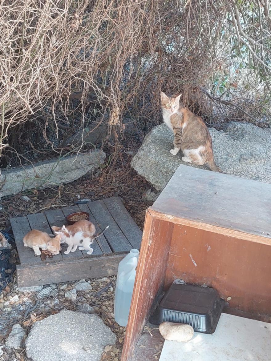 Στη φωτογραφία, φαίνεται η γάτα της γειτονιάς με τα δύο δικά της γατάκια, τα οποία, αν και αντιμετωπίζουν μικρά προβλήματα με τα μάτια τους, φαίνονται υγιή και έχουν διπλάσιο μέγεθος από το μικρό και αδύναμο γατάκι που χρειάζεται βοήθεια.