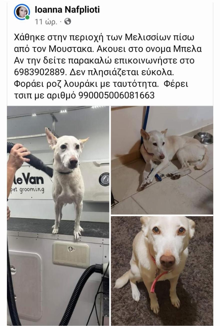 Μια ιστορία αγωνίας και ελπίδας έρχεται από την περιοχή των Μελισσίων, όπου η οικογένεια της Μπέλας, ενός αγαπημένου σκύλου, ζει την αγωνία της αναζήτησής της. Η Μπέλα, ένας γλυκός και φιλικός σκύλος, χάθηκε πίσω από το κατάστημα Μουστάκας και από τότε τα ίχνη της έχουν χαθεί.