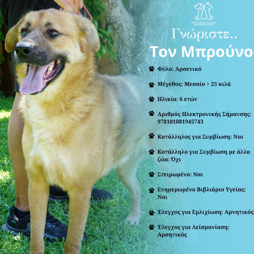 Ο Μπρουνο είναι ένας χαρούμενος και φιλικός σκύλος, έτοιμος να βρει τον δρόμο προς ένα νέο σπίτι και μια αγαπημένη οικογένεια. Αρσενικό, μεγάλου μεγέθους (πάνω από 25 κιλά) και ηλικίας 6 ετών, ο Μπρουνο είναι κατάλληλος για συμβίωση με παιδιά και άλλα ζώα. Έχει στειρωθεί και διαθέτει ενημερωμένο βιβλιάριο υγείας, ενώ οι έλεγχοι για ερλιχιώσεις και λεισμανίαση είναι αρνητικοί. Ο αριθμός ηλεκτρονικής σήμανσης 978101081945743. Εάν ενδιαφέρεστε να τον γνωρίσετε, επικοινωνήστε για περισσότερες πληροφορίες.