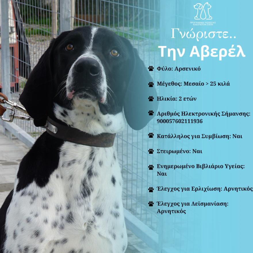 Ο Αβερέλ είναι ένας γοητευτικός σκύλος μεγάλου μεγέθους, αρσενικό, 2 ετών, με ηλεκτρονική σήμανση 900057602111936. Αν και δείχνει αποφασιστικότητα και δυναμισμό, είναι κατάλληλος για συμβίωση με παιδιά αλλά όχι με άλλα ζώα. Ο Αβερέλ είναι στειρωμένος και διαθέτει ενημερωμένο βιβλιάριο υγείας, ενώ οι έλεγχοι για ερλιχιώση και λεισμανίαση έχουν δώσει αρνητικά αποτελέσματα. Με αυτά τα χαρακτηριστικά και την αγάπη του για τους ανθρώπους, ο Αβερέλ αναζητά ένα ζεστό και αγαπημένο σπίτι. Επικοινωνήστε μαζί μας για να τον γνωρίσετε και να του προσφέρετε μια αγκαλιά γεμάτη αγάπη.