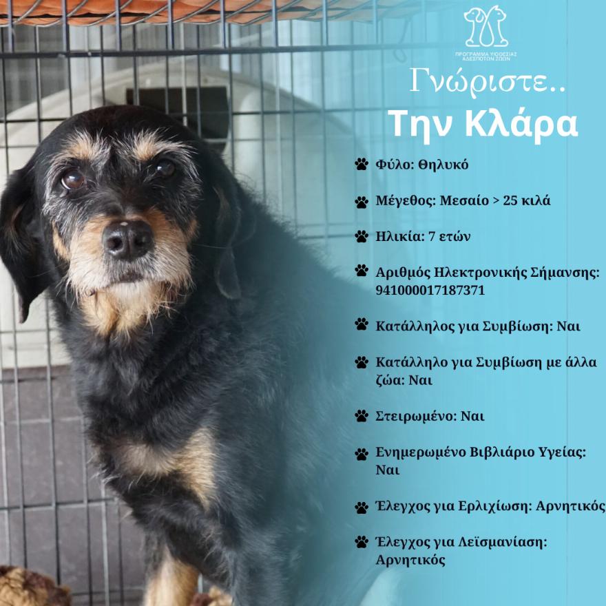 Η Κλάρα είναι ένα μεγάλο θηλυκό σκυλί, επτά ετών, με αριθμό ηλεκτρονικής σήμανσης 941000017187371. Εκτός από το γεγονός ότι είναι στειρωμένη και διαθέτει ενημερωμένο βιβλιάριο υγείας, έχει ελεγχθεί αρνητικά για ερλιχιώσεις και λεισμανίαση. Είναι κατάλληλη για συμβίωση με παιδιά και άλλα ζώα, ενώ η ήπια της φύση την καθιστά ιδανική σύντροφο.