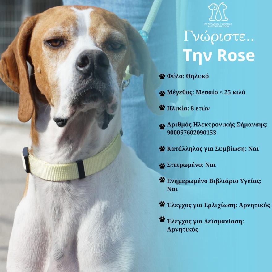 Αν ενδιαφέρεστε να δώσετε στην Rose ένα σπίτι γεμάτο αγάπη και φροντίδα, επικοινωνήστε με την Αστική Πανίδα του Δήμου Αθηναίων για περισσότερες πληροφορίες και για να τον γνωρίσετε. Ας δώσουμε στην Rose την ευκαιρία για ένα νέο, αγαπημένο σπίτι!