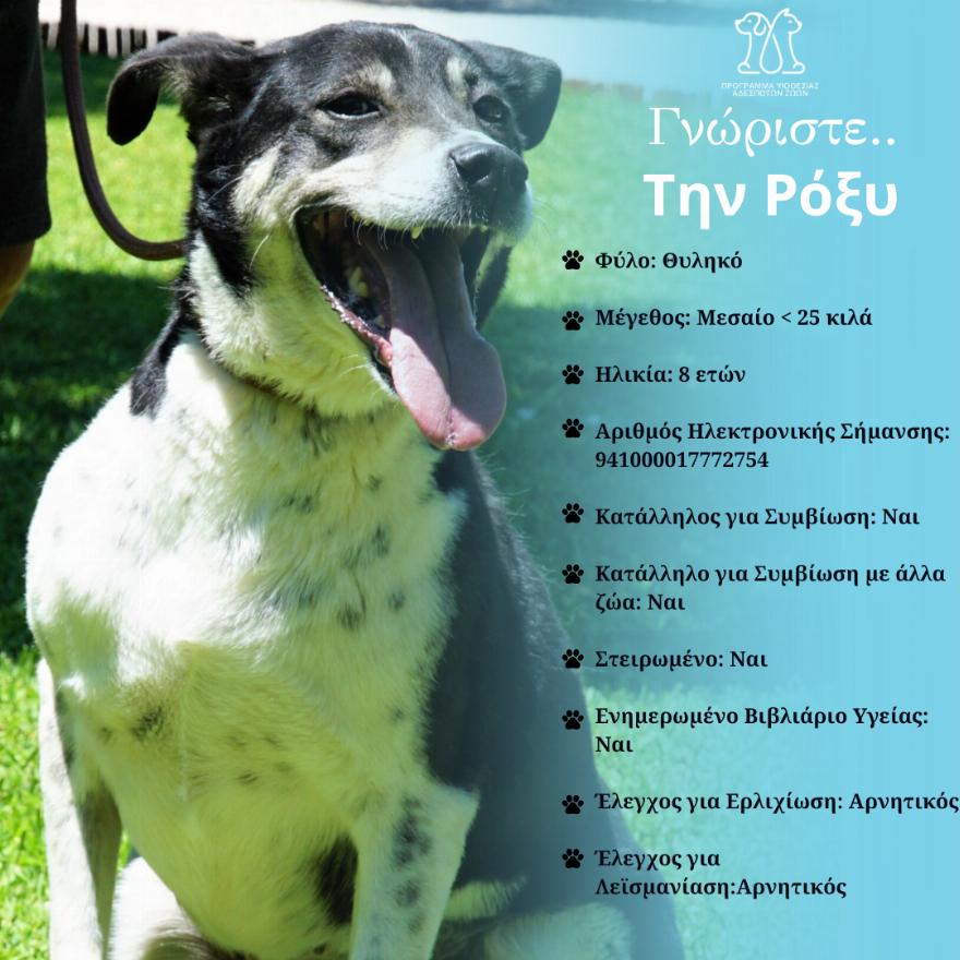 Αν ενδιαφέρεστε να δώσετε στην Ρόξυ ένα σπίτι γεμάτο αγάπη και φροντίδα, επικοινωνήστε με την Αστική Πανίδα του Δήμου Αθηναίων για περισσότερες πληροφορίες και για να τον γνωρίσετε. Ας δώσουμε στην Ρόξυ την ευκαιρία για ένα νέο, αγαπημένο σπίτι!