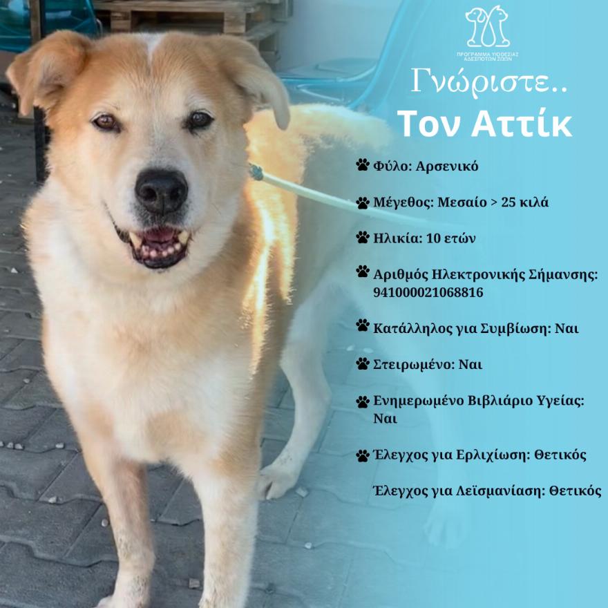 Αν ενδιαφέρεστε να δώσετε στον Αττίκ ένα σπίτι γεμάτο αγάπη και φροντίδα, επικοινωνήστε με την Αστική Πανίδα του Δήμου Αθηναίων για περισσότερες πληροφορίες και για να τον γνωρίσετε. Ας δώσουμε στον Αττίκ την ευκαιρία για ένα νέο, αγαπημένο σπίτι!