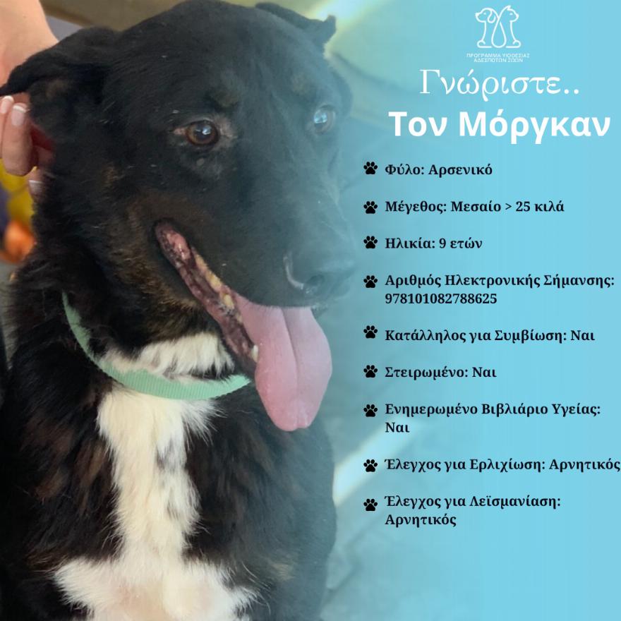 Ο Μόργκαν, ένας εννέα ετών μεγάλος αρσενικός σκύλος, είναι γεμάτος καλοσύνη και αγάπη. Παρά την ηλικία του, διαθέτει ένα ενημερωμένο βιβλιάριο υγείας και αρνητικά αποτελέσματα σε ελέγχους για ερλιχίωση και λεισμανίαση. Κατάλληλος για συμβίωση με παιδιά αλλά όχι με άλλα ζώα, ο Μόργκαν αναζητά ένα σπίτι και έναν ανθρώπινο σύντροφο που θα τον αγαπήσει και θα τον φροντίζει. Εάν θέλετε να γνωρίσετε τον Μόργκαν, επικοινωνήστε με την υπηρεσία μας για περισσότερες πληροφορίες και για να τον υιοθετήσετε.