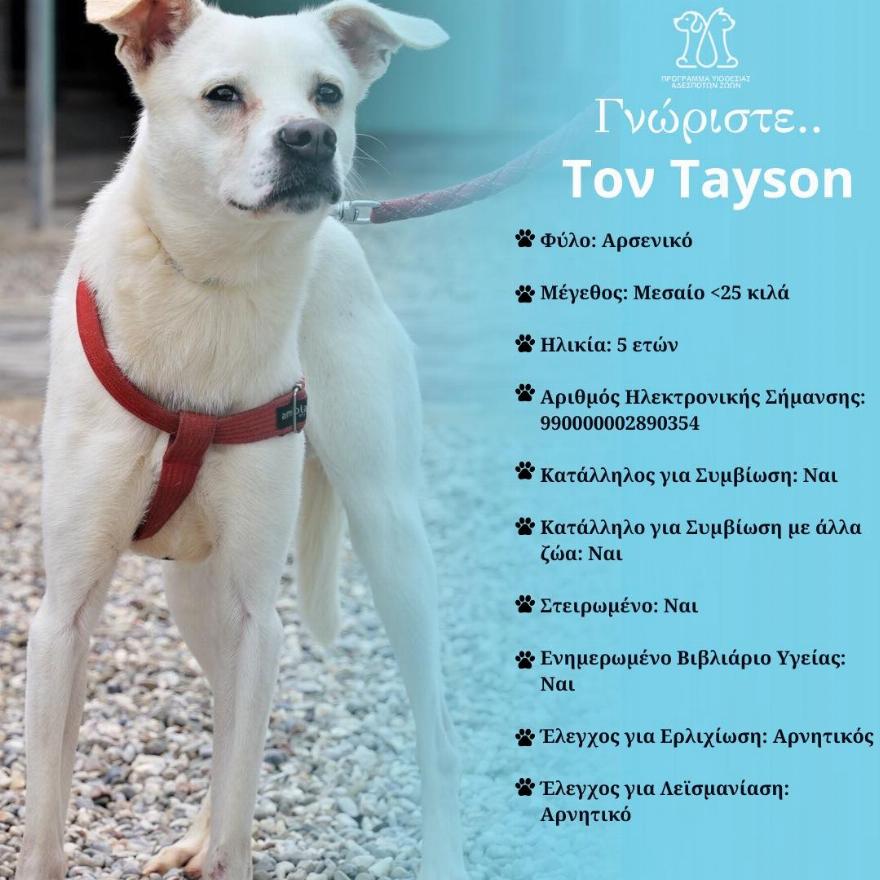 Αν ενδιαφέρεστε να δώσετε στον Τάισον ένα σπίτι γεμάτο αγάπη και φροντίδα, επικοινωνήστε με την Αστική Πανίδα του Δήμου Αθηναίων για περισσότερες πληροφορίες και για να τον γνωρίσετε. Ας δώσουμε στον Τάισον την ευκαιρία για ένα νέο, αγαπημένο σπίτι!