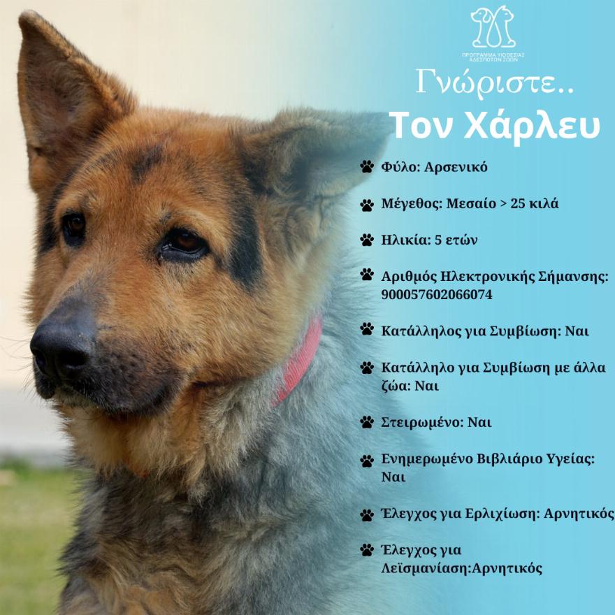 Αν ενδιαφέρεστε να δώσετε στην Χαρλεη ένα σπίτι γεμάτο αγάπη και φροντίδα, επικοινωνήστε με την Αστική Πανίδα του Δήμου Αθηναίων για περισσότερες πληροφορίες και για να τον γνωρίσετε. Ας δώσουμε στην Χαρλεη την ευκαιρία για ένα νέο, αγαπημένο σπίτι!