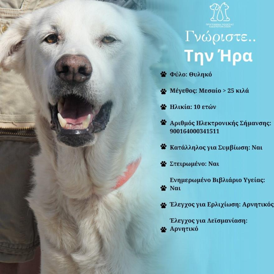 Ονομάζεται Ήρα και είναι θηλυκή, μεγάλη σε μέγεθος (πάνω από 25 κιλά) και 10 ετών. Ο αριθμός ηλεκτρονικής της σήμανσης είναι 900164000341511. Η Ήρα είναι κατάλληλη για συμβίωση τόσο με παιδιά όσο και με άλλα ζώα. Είναι στειρωμένη και διαθέτει ενημερωμένο βιβλιάριο υγείας. Οι έλεγχοι για ερλιχίωση και λεισμανίαση ήταν αρνητικοί.