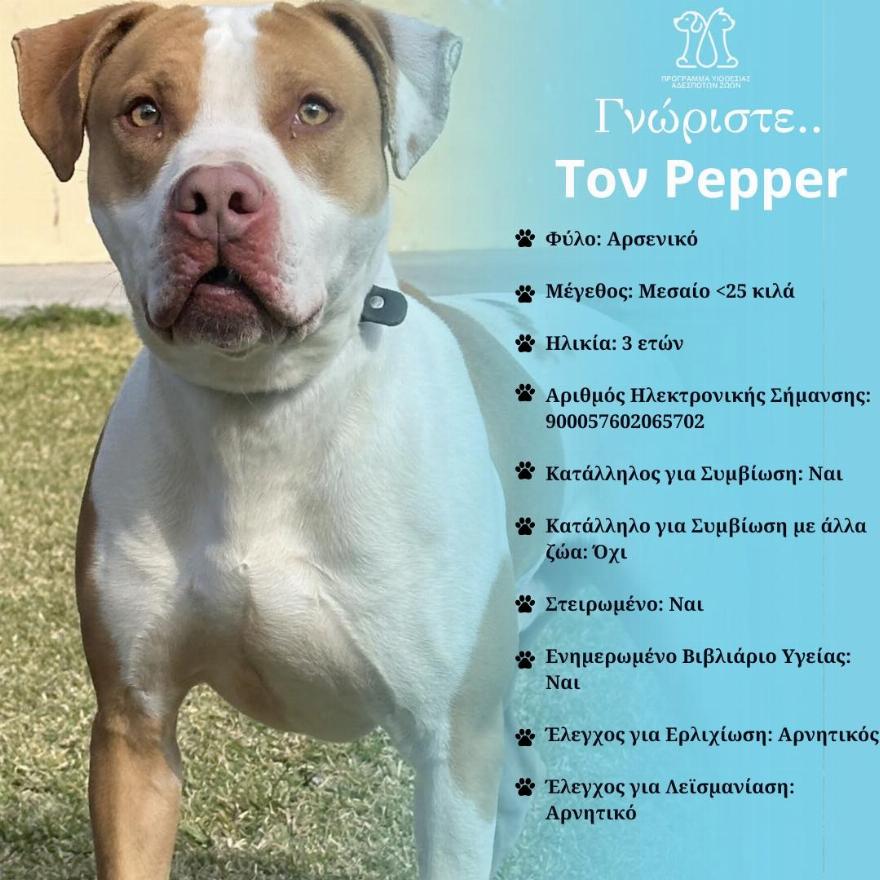 Ας γνωρίσουμε τον Pepper, έναν γλυκό σκύλο με αξιολάτρευτο χαρακτήρα. Τριών ετών και αρσενικός, ο Pepper ακτινοβολεί ζεστασιά και φιλικότητα. Με ένα βλέμμα γεμάτο παιχνιδιάρικη περιέργεια, θα γίνει ένας αγαπημένος σύντροφος για όσους θέλουν να μοιραστούν τη ζωή τους με ένα πιστό φίλο. Ο Pepper είναι μεσαίου μεγέθους σκύλος, με παιχνιδιάρικη προσωπικότητα που τον καθιστά ιδανικό για συμβίωση με παιδιά. Ο Pepper είναι ένας πολύ ανθρωποκεντρικός σκύλος. Όσο πολύ αγαπάει τους ανθρώπους και τα χάδια , άλλο τόσο θέλει να είναι ο κυρίαρχος στη σχέση. Για αυτό χρειάζεται δίπλα του έναν άνθρωπο με σταθερότητα , αγάπη και συνέπεια στην εκπαίδευση του. Είναι ήδη στειρωμένος και διαθέτει ενημερωμένο βιβλιάριο υγείας, προσφέροντας ένα αίσθημα ασφάλειας στους νέους του ιδιοκτήτες. Παρόλο που ίσως δεν είναι ο κατάλληλος σύντροφος για συμβίωση με άλλα ζώα, η αφοσίωση και η αγάπη του Pepper θα κερδίσουν την καρδιά μιας οικογένειας που αναζητά έναν αξιόπιστο και αγαπημένο τετράποδο σύντροφο.