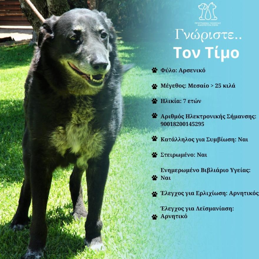 Ονομάζεται Τίμος και είναι αρσενικός, μεγάλος σε μέγεθος (πάνω από 25 κιλά) και 7 ετών. Ο αριθμός ηλεκτρονικής του σήμανσης είναι 90018200145295. Ο Τίμος είναι κατάλληλος για συμβίωση τόσο με παιδιά όσο και με άλλα ζώα. Είναι στειρωμένος και έχει ενημερωμένο βιβλιάριο υγείας. Οι έλεγχοι για ερλιχίωση και λεισμανίαση ήταν αρνητικοί.