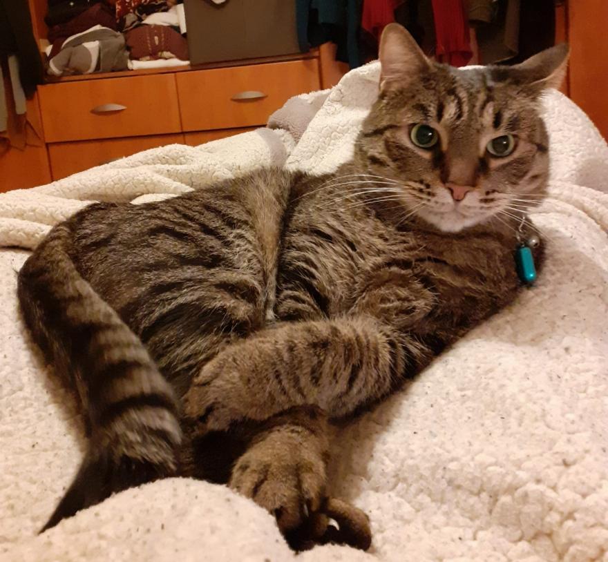 Ο γάτος είναι μεγαλόσωμος, με φαλακρή κοιλιά και ένα πλευρό λόγω αλλεργίας που είχε στο παρελθόν.