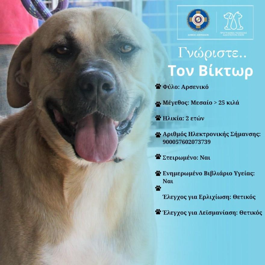 Αν ενδιαφέρεστε να δώσετε στον Βίκτωρ ένα σπίτι γεμάτο αγάπη και φροντίδα, επικοινωνήστε με την Αστική Πανίδα του Δήμου Αθηναίων για περισσότερες πληροφορίες και για να τον γνωρίσετε. Ας δώσουμε στον Βίκτωρ την ευκαιρία για ένα νέο, αγαπημένο σπίτι!