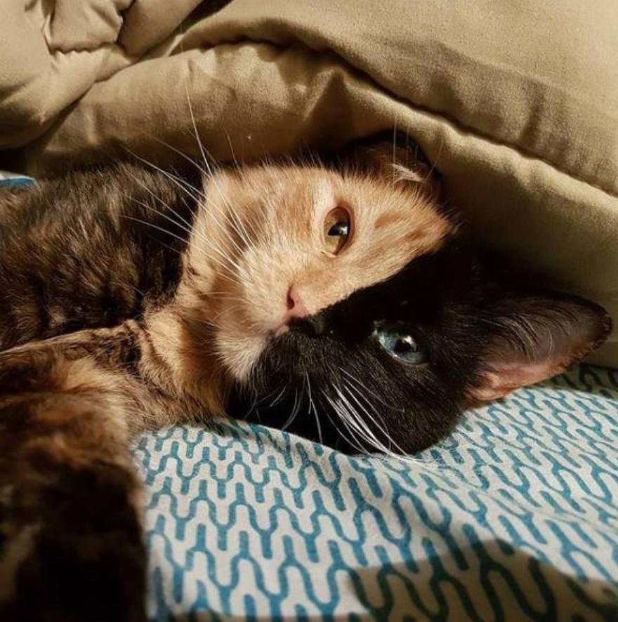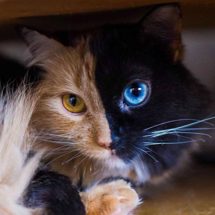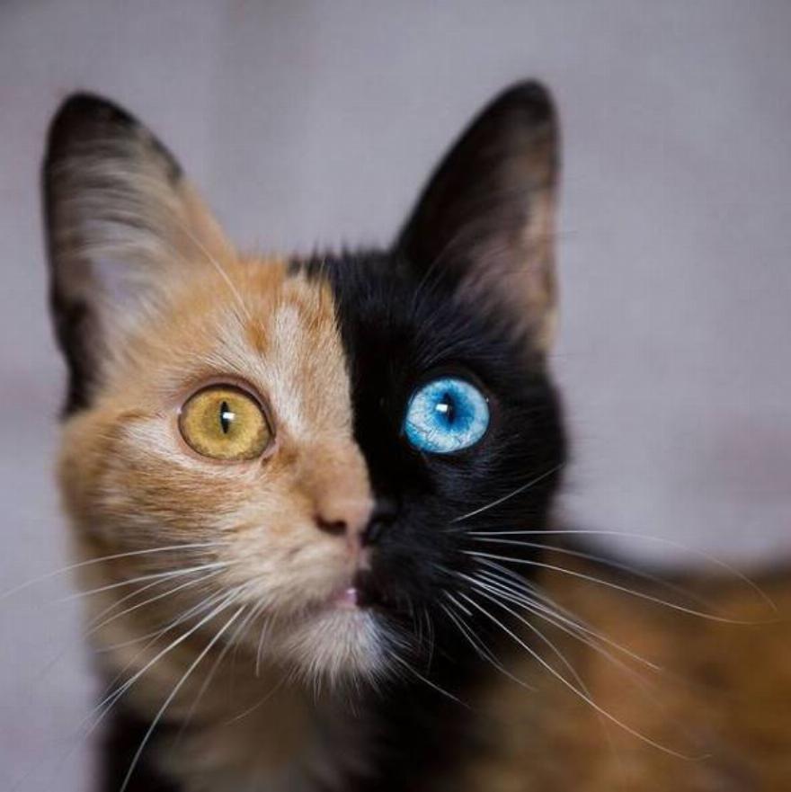 Αυτή η εξωτική γατούλα με τα δύο διαφορετικά χρωματιστά μάτια και το τριχωτό πρόσωπο που μοιράζεται ομοίως σε δύο διαφορετικά χρώματα, ανήκει σε μια σπάνια, V.I.P. ομάδα γατών που μπορεί (ή μπορεί και όχι …) να είναι χίμαιρες.