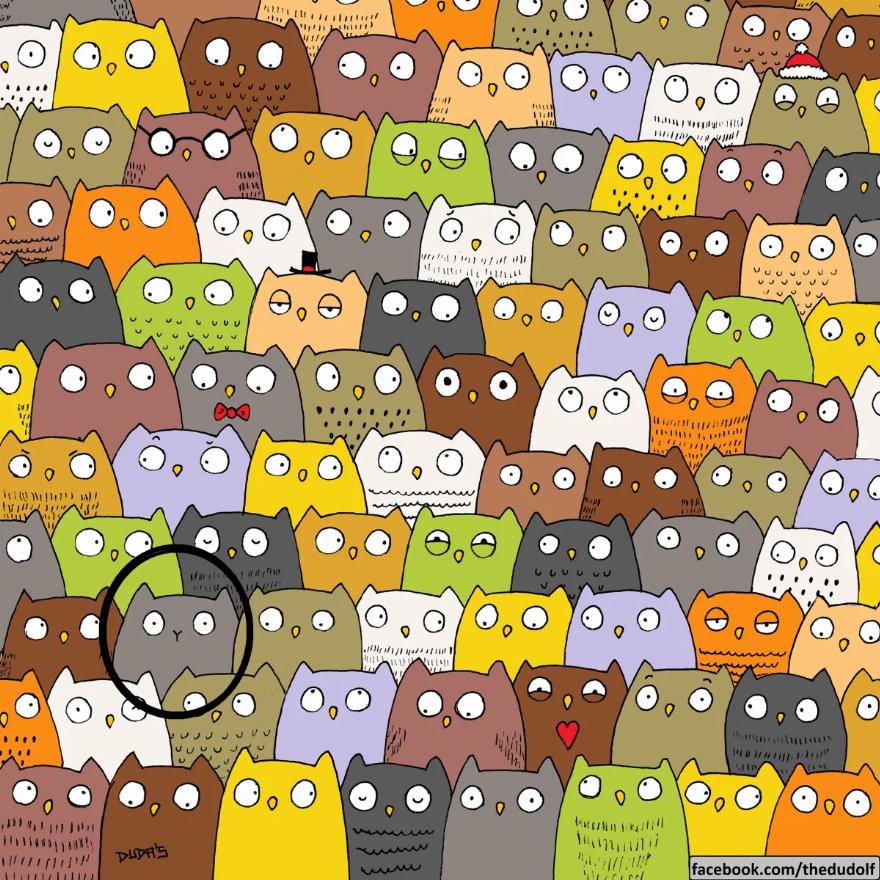 Η συγκεκριμένη οπτική ψευδαίσθηση είναι δύσκολη. Στην παρακάτω εικόνα υπάρχουν δεκάδες κουκουβάγιες και ανάμεσά τους είναι κρυμμένη μία γάτα.