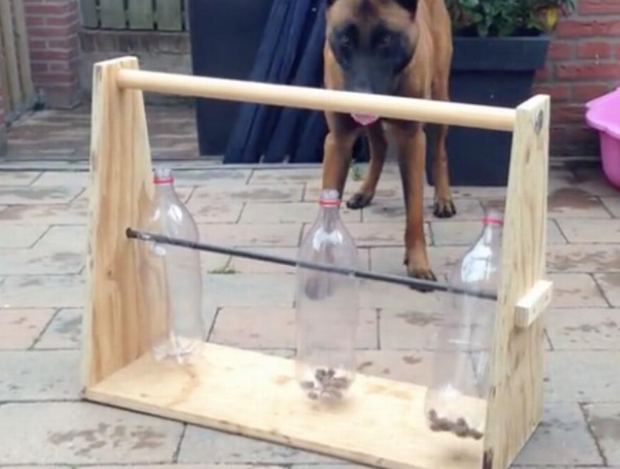 Για αυτό το παιχνίδι, χρησιμοποιήστε πλαστικά μπουκάλια σόδας, μια μεταλλική ράβδο και μια ξύλινη βάση για να δημιουργήσετε λιχουδιές σε ένα μπουκάλι. Βάλτε τρία μπουκάλια σόδας μέσα από τη μεταλλική ράβδο και στερεώστε τα στην ξύλινη βάση. Βάλτε λιχουδιές σε δύο από τα μπουκάλια και παρακολουθήστε τον σκύλο σας να προσπαθεί να πάρει τις λιχουδιές από τα μπουκάλια
