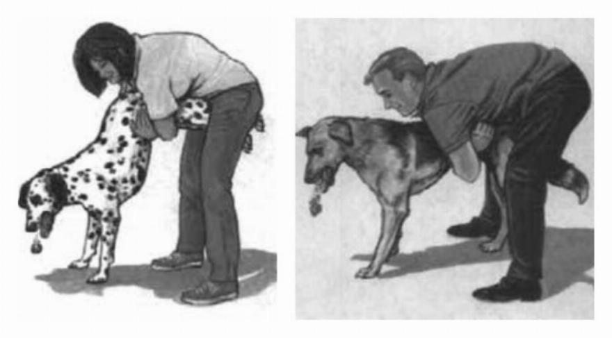 - Εάν ο σκύλος σας εξακολουθεί να πνίγεται και είναι μεγαλύτερος σκύλος, σηκώστε τα πίσω πόδια του ώστε να είναι σε «πόζα τροχού» ή σε στάση χειρός. Αν είναι μικρόσωμος σκύλος, μπορείτε να τα σηκώσετε και να τα κρατήσετε ανάποδα με τη μύτη τους να δείχνει προς το έδαφος. Ενώ ο σκύλος σας είναι ανάποδα, πιέστε σταθερά τα χέρια σας στην κοιλιά του σκύλου σας από κάτω αλλά προς τα πλευρά πέντε φορές. Εναλλακτικά, μπορείτε να τυλίξετε τα χέρια σας γύρω από την κοιλιά του σκύλου σας ακριβώς κάτω από τα πλευρά και να σπρώξετε τη γροθιά σας προς τα πάνω στην κοιλιά και προς τα πλευρά. Αυτός είναι ο ελιγμός Heimlich για σκύλους και αναγκάζει το διάφραγμα να συμπιέσει τους πνεύμονες και να σπρώξει τον αέρα έξω από την τραχεία σε μια προσπάθεια να απομακρύνει ό,τι έχει κολλήσει.