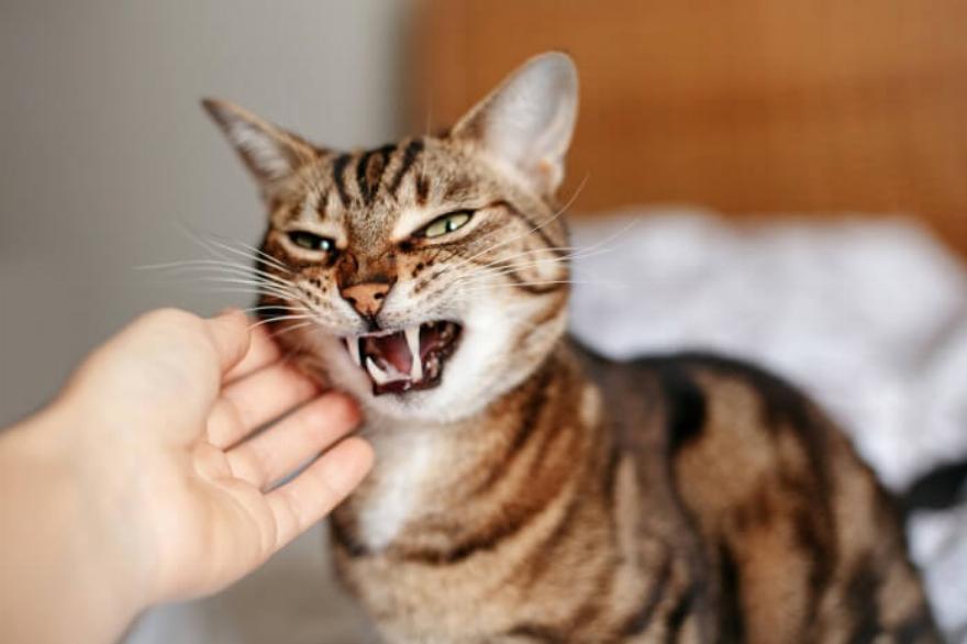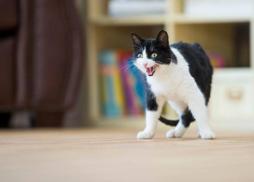 Οι φωνές που γίνονται με το στόμα ανοιχτό υποδηλώνουν επιθετικότητα: γρύλισμα, ουρλιαχτό, γρύλισμα ή κλαψούρισμα. Αυτά μπορεί να είναι είτε επιθετικά είτε αμυντικά, και αν δεν είναι επιτυχής η αποκλιμάκωση της σύγκρουσης οι γάτες μπορεί να προχωρήσουν σε φτύσιμο ή ουρλιαχτό στον αντίπαλό τους πριν αρχίσει η σωματική μάχη με νύχια και δόντια.