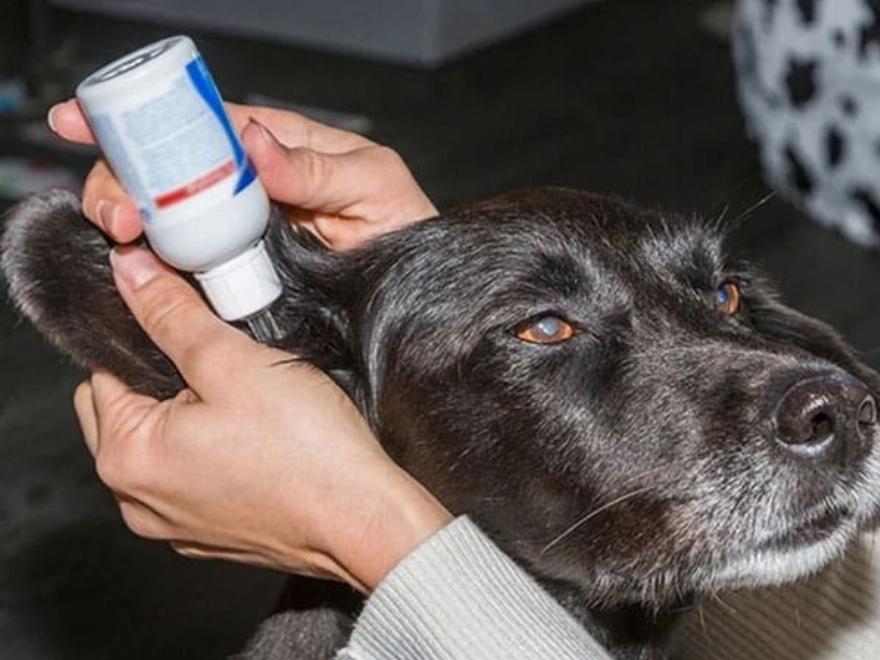 Σηκώστε απαλά το αυτί του σκύλου και ρίξτε λίγες σταγόνες καθαριστικού.