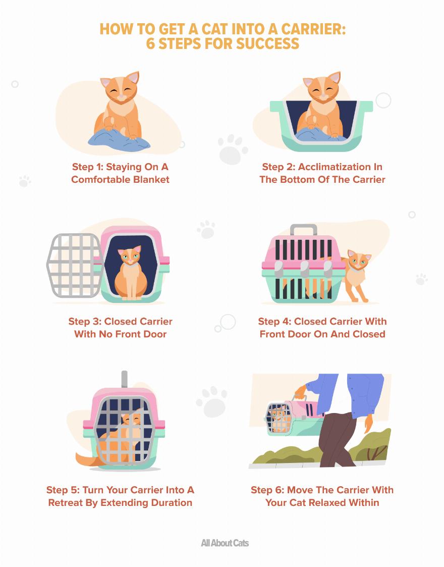 Ξεκινήστε προσελκύοντας τη γάτα σας πάνω στην κουβέρτα με μερικές λιχουδιές και συνεχίστε να της χορηγείτε τροφή όσο δείχνει ήρεμη συμπεριφορά, ενθαρρύνετε την εκούσια είσοδο/έξοδο με το τάισμα και το τρίψιμο του πηγουνιού με ήρεμο τρόπο όσο βρίσκεται στο μεταφορέα. Αποφύγετε την υπερβολική διέγερση, πηγαίνοντας όμορφα και αργά.