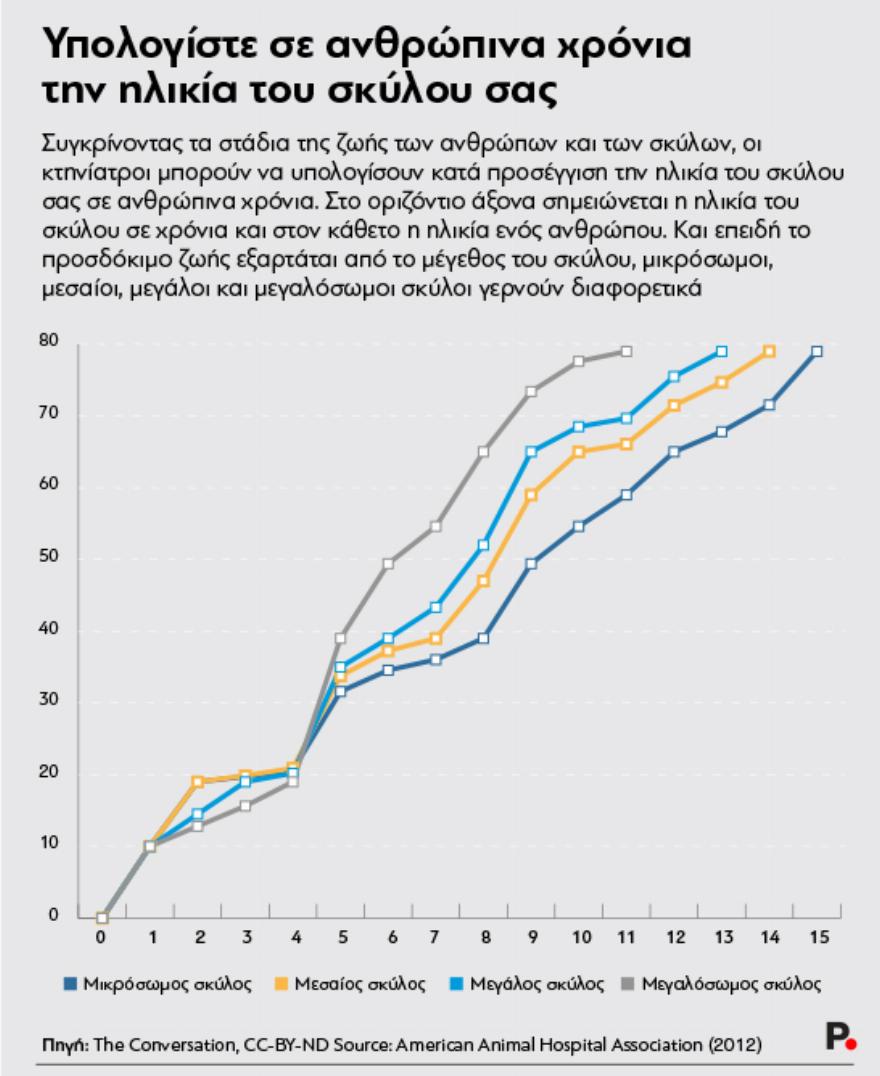 Υπολογίζοντας το μέγεθος του σκύλου σας και ακολουθώντας την αντίστοιχη γραμμή, μπορείτε να υπολογίσετε αν το μαλλιαρό «μωρό» σας ισοδυναμεί με έναν δραστήριο πενηντάρη ή με έναν ώριμο κύριο 80 ετών. Οι γατόφιλοι, εξάλλου, μπορούν να ρίξουν μια ματιά στο αντίστοιχο διάγραμμα για γάτες.