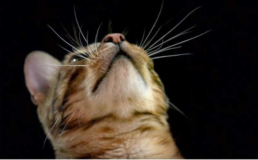 Η γάτα σε αυτήν τη περίπτωση έχει ανακαλύψει κάτι καινούριο και έχει διάθεση για παιχνίδια. Τα μουστάκια της, ως μικροί αισθητήρες, είναι σε ετοιμότητα για να τη βοηθήσουν, ανιχνεύοντας, ανεπαίσθητα για εμάς, ερεθίσματα και βοηθώντας την, για παράδειγμα, να εντοπίσει το παιχνίδι της ή να εξερευνήσει ένα καινούριο αντικείμενο που βρέθηκε στο χώρο.