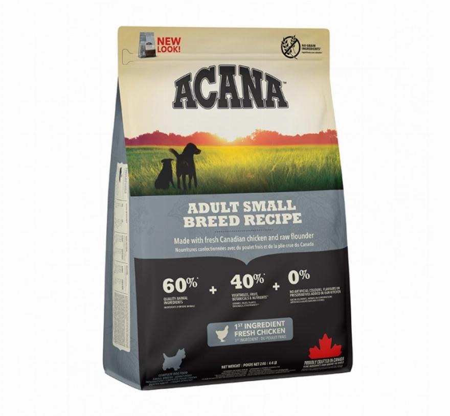 Η πλήρης τροφή Acana Adult Small Breed για ενήλικα σκυλιά μικρού μεγέθους με κοτόπουλο, γαλοπούλα και ρέγγα. Συγκεκριμένα, αποτελείται από 60% ποιοτικών ζωικών πρωτεϊνων, συστατικά τα οποία είναι απαραίτητα για την μυική ανάπτυξη και τη ευεξία του σκύλου σας. Συμβάλλει στην υγιή ανάπτυξη του μυικού συστήματος και των οστών, λόγω της υψηλής περιεκτικότητας ακατέργαστης πρωτεϊνης, ενώ τα λιπαρά οξέα EPA-DHA και η ταυρίνη διατηρούν την καλή υγεία του εγκεφάλου και των ματιών, που είναι το κλειδί για μια μακρά και υγιή ζωή. Περιέχει 20% φρούτα και λαχανικά εποχής καθώς και βότανα, εξαιρετική πηγή βιταμινών και μεταλλικών στοιχείων αναγκαία για την σωστή λειτουργία του ανασοποιητικού συστήματος καθώς και 20% αλεσμένη βρώμη, που είναι μία υποαλλεργική πηγή εύπεπτων υδατανθράκων με χαμηλό γλυκαιμικό δείκτη.Η τροφή αυτή είναι ένας ανεκτίμητος σύμμαχος για την καλή υγεία του σκύλου σας, καθώς και για ένα υγιές τρίχωμα και δέρμα λόγω των Ω-3 και Ω-6 λιπαρών που περιέχει. Η Acana Αdult Small Breed συνιστά επομένως την ολοκληρωμένη λύση για μια ισορροπημένη και υγιή για το μικρό σας σκυλάκι.