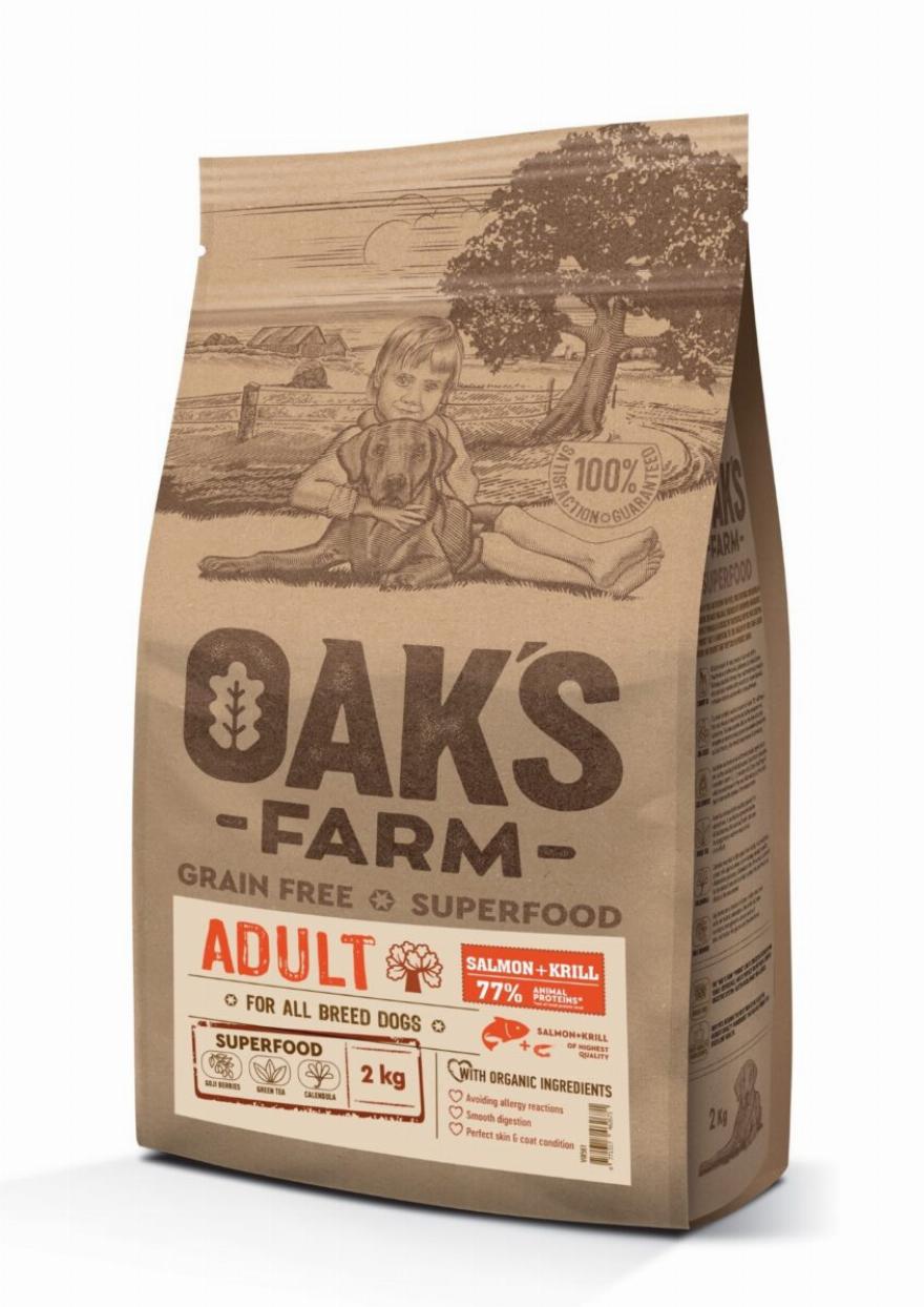 Η πλήρης τροφή της Oak’s Farm Grain Free All Adult Salmon & Krill χωρίς σιτηρά με σολομό και κριλ που απευθύνεται σε ενήλικα σκυλάκια ανεξαρτήτως φυλής, είναι η ιδανική επιλογή για τον τετράποδο φίλο σας. Ηλικιακά είναι επιτρέπτο σε σκυλάκια μετά το 1ο έτος της ηλικίας τους. Όταν οι τροφές είναι Grain Free, δηλαδή δεν περιέχουν σιτηρά, βοηθάει στην αποφυγή αλλεργιών. Σε αυτές τις ηλικίες, ο συνδυασμός κάποιων συστατικών όπως, ο λιναρόσπορος, οι φρουκτοολιγοσακχαρίτες (FOS), το εκχύλισμα γιούκα, τα μούρα, το πράσινο τσάι και η καλέντουλα είναι απαραίτητα στοιχεία για την σωστή σύνθεση του οργανισμού! Η Oak’s Farm Grain Free All Adult Salmon & Krill 12kg συνιστά επομένως την ολοκληρωμένη λύση για μια ισορροπημένη και υγιή ζωή για τον σκύλο σας!