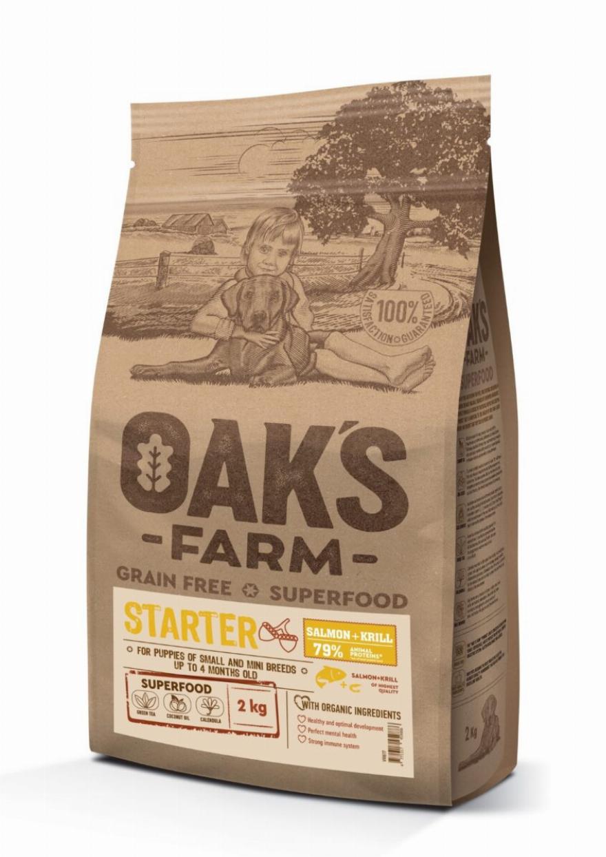 Η πλήρης τροφή Oak’s Farm Grain Free Small Starter Salmon χωρίς σιτηρά με σολομό και κριμ που απευθύνεται σε ανήλικα σκυλάκια, κυρίως μικρόσωμης φυλής είναι η ιδανική επιλογή για τον τετράποδο φίλο σας. Ηλικιακά είναι επιτρέπτο σε σκυλάκια έως 4 μηνών, καθώς επίσης και για θηλάζουσες ή εγκυμονούσες σκυλίτσες! Όταν οι τροφές είναι Grain Free, δηλαδή δεν περιέχουν σιτηρά, βοηθάει στην αποφυγή αλλεργιών. Στις πιο νεαρές ηλικίες, ειδικά στο ξεκίνημα της ανάπτυξης ο συνδυασμός κάποιων συστατικών όπως, το έλαιο της καρύδας, οι φρουκτοολιγοσακχαρίτες (FOS), ο λιναρόσπορος, το εκχύλισμα γιούκα ,ένα ιδιαίτερα αντιφλεγμονώδες συστατικό, το πράσινο τσάι και η καλεντούλα είναι απαραίτητα στοιχεία για την σωστή σύνθεση του οργανισμού! Η Oak’s Farm Grain Free sm Starter Salmon συνιστά επομένως την ολοκληρωμένη λύση για μια ισορροπημένη και υγιή ζωή για τον σκύλο σας!