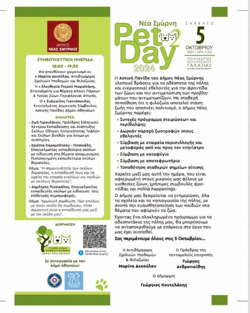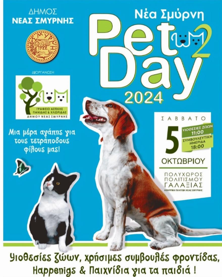Το Σάββατο 5 Οκτωβρίου, ο Δήμος Νέας Σμύρνης διοργανώνει εκδήλωση για την ευαισθητοποίηση και φροντίδα των αδέσποτων ζώων, με ποικίλες δράσεις και εκπαιδευτικές εκδηλώσεις.