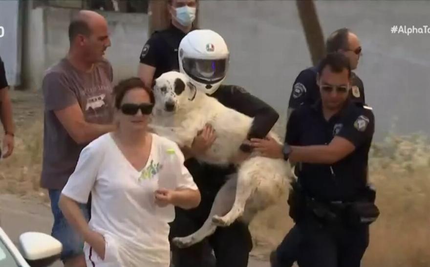 Ο δημοσιογράφος Γιώργος Κουρδής, μετέδιδε το ρεπορτάζ από το σημείο της πυρκαγιάς στη δυτική Αττική, όταν η κάμερα της εκπομπής «Alpha Τώρα» κατέγραψε τη στιγμή της διάσωσης του άτυχου τετράποδου από δύο αστυνομικούς και έναν κάτοικο της περιοχής.
