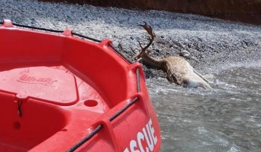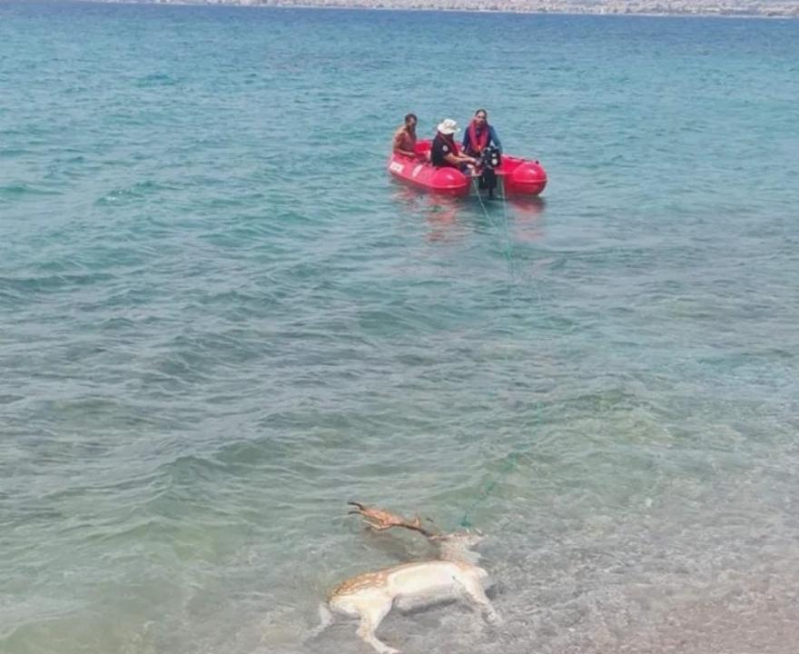 Μια θλιβερή ανακάλυψη έγινε το πρωί της Δευτέρας (19/08), όταν λουόμενοι εντόπισαν ένα νεκρό ελάφι να επιπλέει στη θάλασσα στην περιοχή του Αλμυρού στην Καλαμάτα. Εθελοντές έδεσαν το άτυχο ζώο και το έσυραν στην ακτή.
