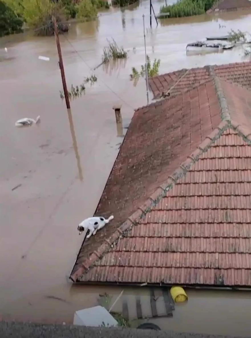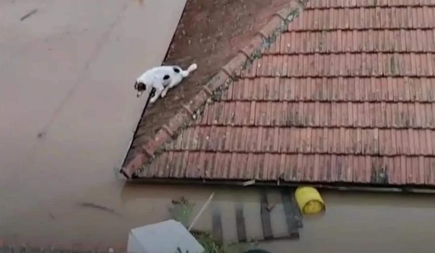 Η παρακάτω φωτογραφία ντοκουμέντο δείχνει έναν σκύλο να σκαρφαλώνει στην οροφή ενός σπιτιού.