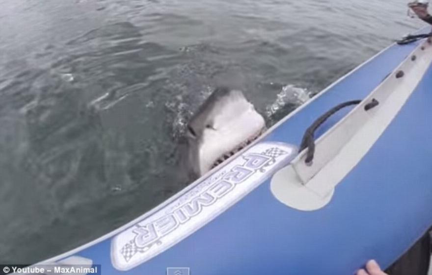 Η στιγμή που ένας καρχαρίας δάγκωσε και ξεφούσκωσε μια βάρκα στα ανοικτά των ακτών της Νότιας Αφρικής έχει καταγραφεί σε εξαιρετικό βίντεο.