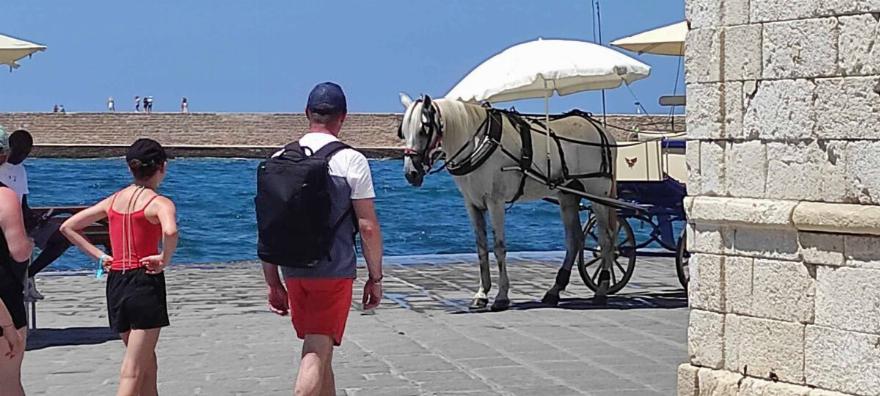 Σύμφωνα με καταγγελία στη σελίδα για την προστασία των ζώων στα Χανιά, τα άλογα της άμαξας περιμένουν τον επόμενο πελάτη τους σε θερμοκρασίες που φτάνουν τους 40°C κάτω από τον καυτό ήλιο.