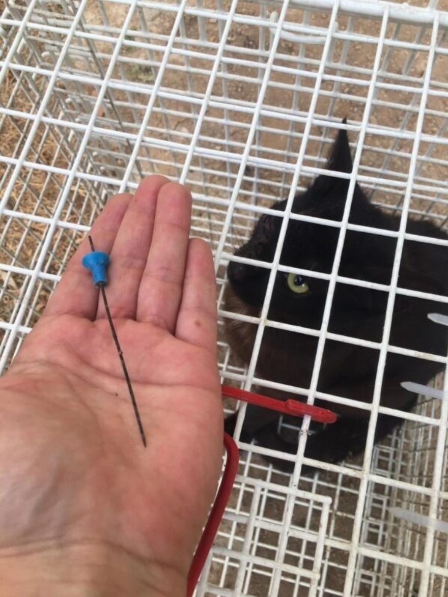 Μετά από μια πολύωρη μαραθώνια προσπάθεια, μέσα σε πολύ δύσκολες συνθήκες, και με μεγάλη υπομονή και επιμονή, ο τραυματισμένος γάτος πιάστηκε και μεταφέρθηκε επειγόντως σε κτηνιατρείο. Όπως φαίνεται και στις φωτογραφίες, το ζώο είχε χτυπηθεί με ένα τύπο φυσοκάλαμου με βέλη.