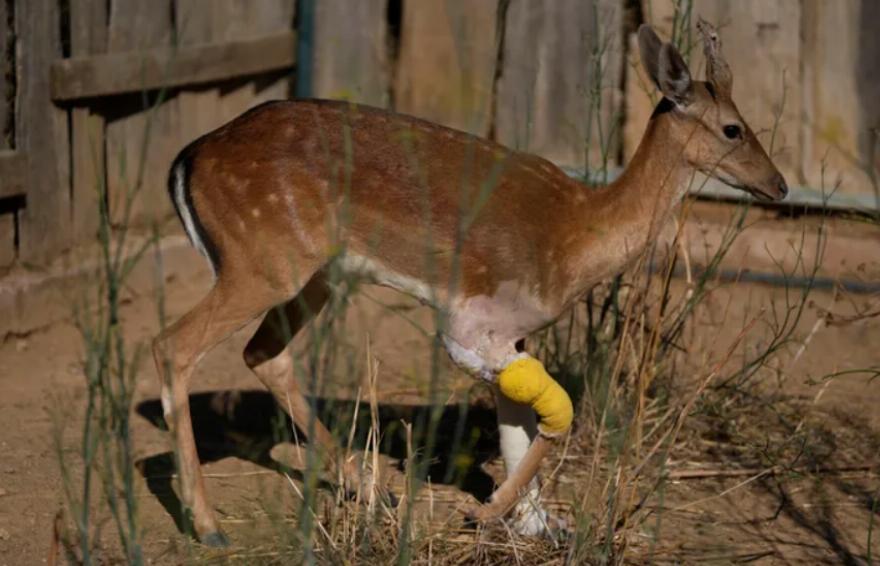 Ο ζωολογικός κήπος φροντίζει ένα τραυματισμένο ελάφι και αρκετές χελώνες – μερικές από τις οποίες έχουν ρόδες από παιχνίδια για να διευκολύνουν την κινητικότητά τους – που υπέστησαν εγκαύματα και άλλους τραυματισμούς κατά τη διάρκεια της πυρκαγιάς στη Ρόδο.