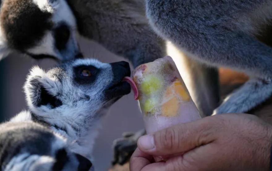 «Σε γενικές γραμμές, η ζέστη επηρεάζει τα ζώα με τον ίδιο τρόπο που επηρεάζει τους ανθρώπους», δήλωσε ο κ. Μπαλάς, αφού τάισε φρούτα- παγωτά σε λεμούριους με δακτυλιοειδή ουρά, μερικοί από τους οποίους σκαρφάλωσαν στους ώμους του για να σερβιριστούν πρώτοι.