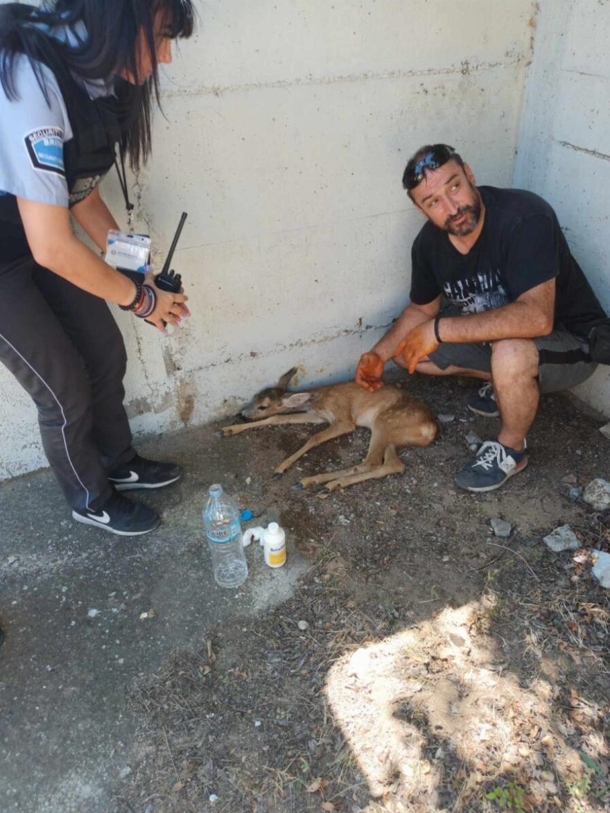 Γυρίσαμε, λοιπόν, ξανά πίσω και πράγματι βρήκαμε εκεί τον κύριο Γιάννη, υπάλληλο στις δομές, ο οποίος είδε το μικρό ζαρκάδι πεσμένο κάτω, τελείως αδύναμο και αφυδατωμένο, με ένα τραύμα στο λαιμό και ειδοποίησε τις αρχές, την αστυνομία Σιντικής και κατόπιν εμάς.
