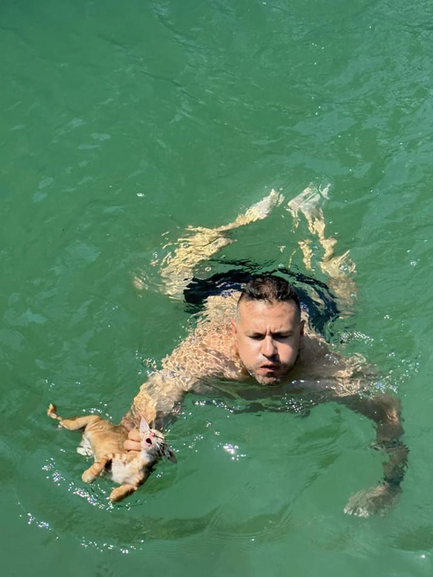 «Για άγνωστο λόγο το γατάκι βρέθηκε μέσα στην θάλασσα… Ο Thanasis Chiotis με την βοήθεια του George Karnesis, πλήρωμα του ferry boat, βούτηξε χωρίς δεύτερη σκέψη, το έσωσε και θα το υιοθετήσει με την αγάπη που ξέρω καλά ότι χρόνια τον διακρίνει… Ένα μεγάλο ευχαριστώ από καρδιάς και στους δύο καλούς φίλους».