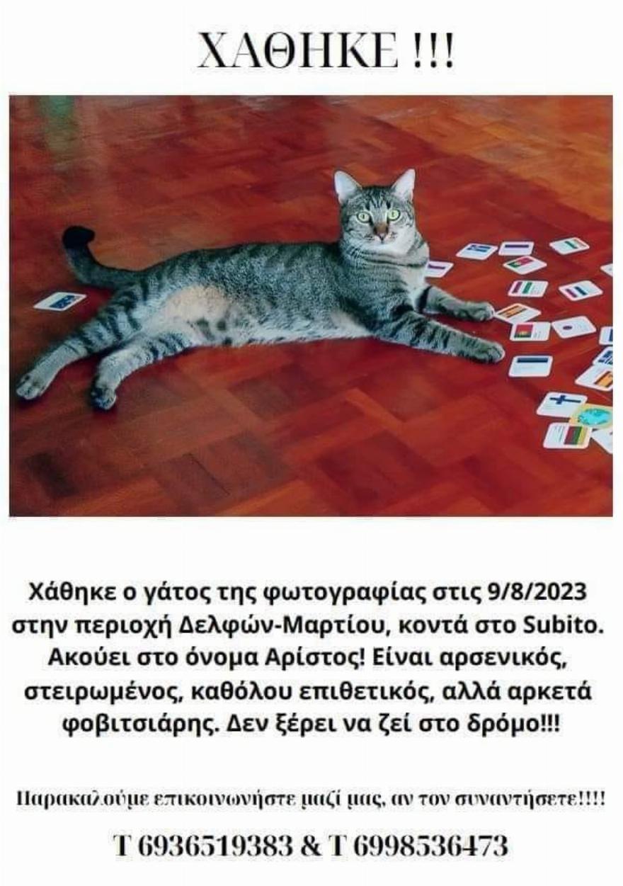 ΧΑΘΗΚΕ ο εικονιζόμενος γάτος στις 9/8/23, στην περιοχή Δελφών-Μαρτίου, κοντά στο Subito. Ακούει στο όνομα Αρίστος. Είναι αρσενικός, στειρωμένος, καθόλου επιθετικός αλλά αρκετά φοβητσιάρης. ΔΕΝ ΞΕΡΕΙ ΝΑ ΖΕΙ ΣΤΟ ΔΡΟΜΟ.