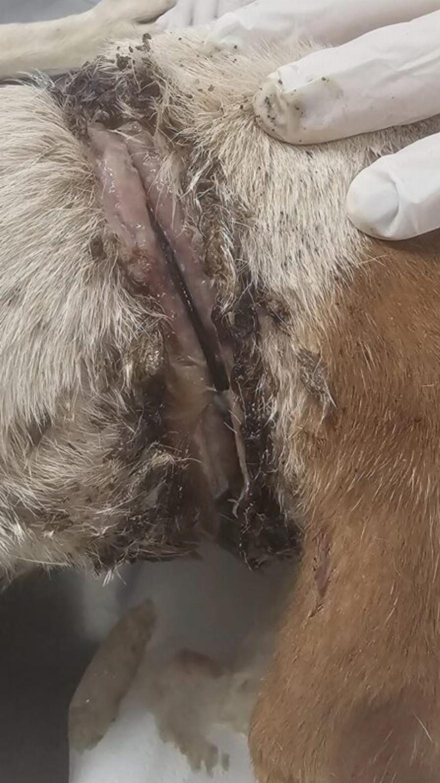 Το ζώο είχε σύρμα από παγίδα δεμένο στο λαιμό του με αποτέλεσμα να πονάει και να μην μπορεί να φάει καλά. Μάλιστα, όπως αναφέρεται, το σκυλί ήταν πολύ καιρό σε αυτή την κατάσταση. Για αυτό το λόγο ήταν και φοβικό και δεν πανιόταν εύκολα.