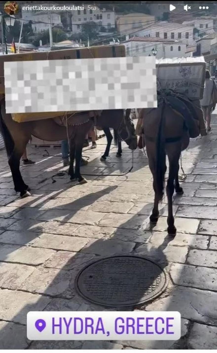 Στο βίντεο που δημοσίευσε άλογα και γαϊδουράκια στην Ύδρα φαίνονται υπερφορτωμένα μέσα στο λιοπύρι να μεταφέρουν ογκώδη πράγματα.